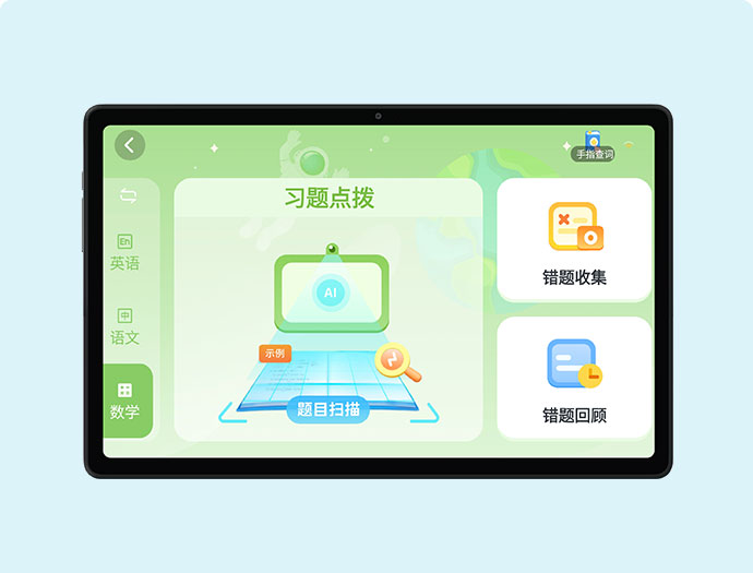平板通过智慧眼,识别题目内容。找到知识点,给孩子视频微课讲解。然后再出题进行训练,巩固知识点。