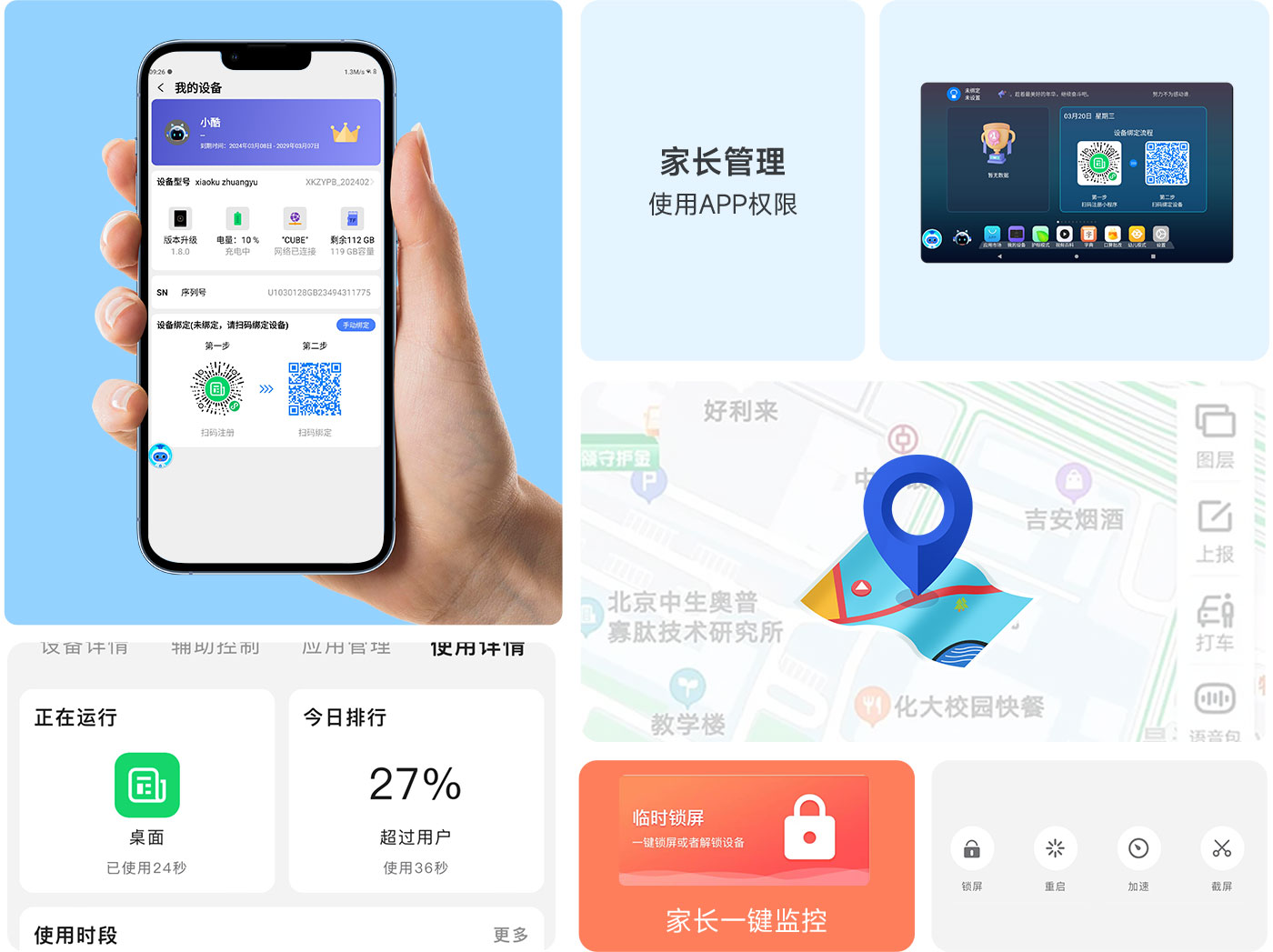 家长可通过小程序,控制平板的使用时间、使用APP权限、定位、页面截图等功能实现平板管控。