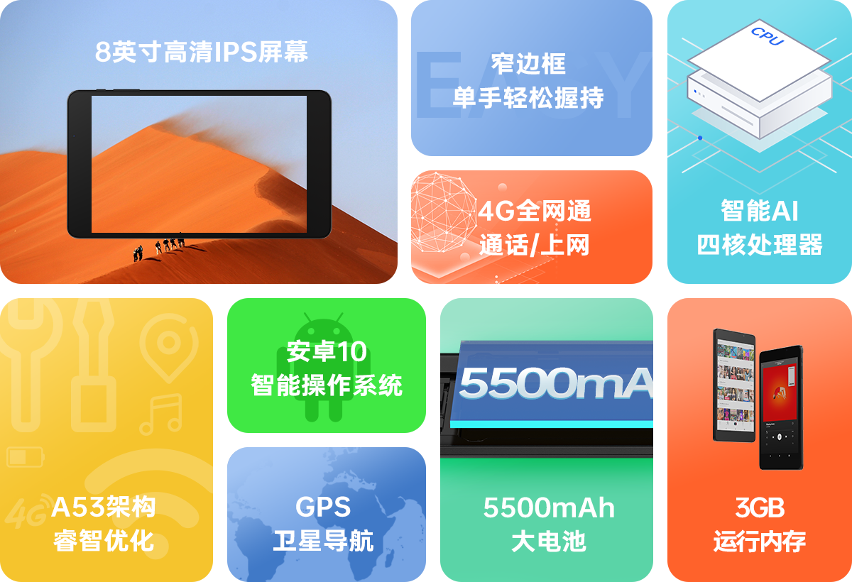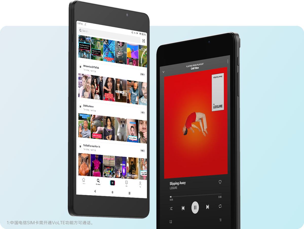 iPlay 8T支持TDD+FDD双4G网络接入,覆盖中国移动、中国电信、中国联通三大运营商网络,随时随地轻松通话/上网。