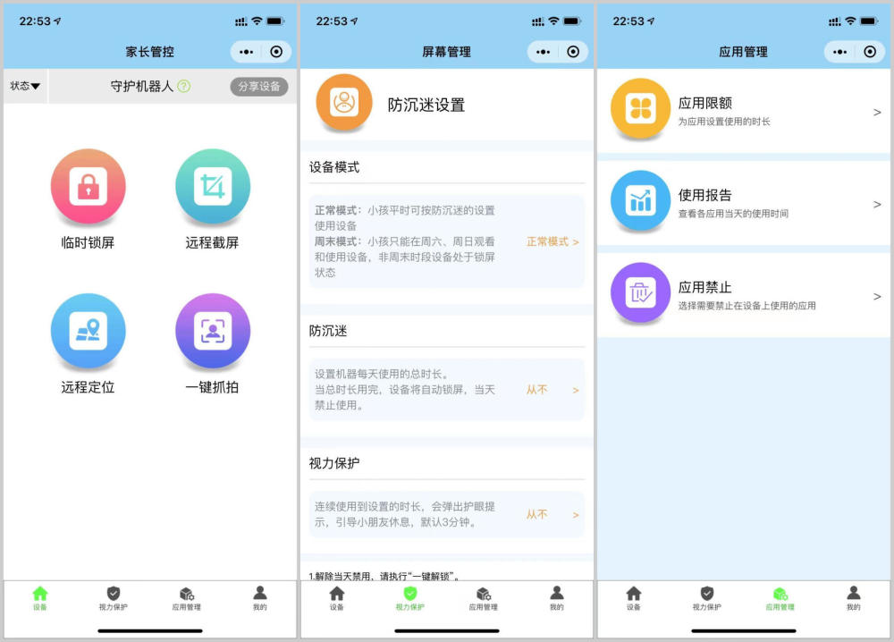 家长可以点击家长管控功能绑定管理员账号,在守护猫家长管控小程序上进行远程管控。临时锁屏可以在远程环境下直接将平板锁住,提醒小朋友停止使用屏幕,休息一会,保护小朋友的视力。