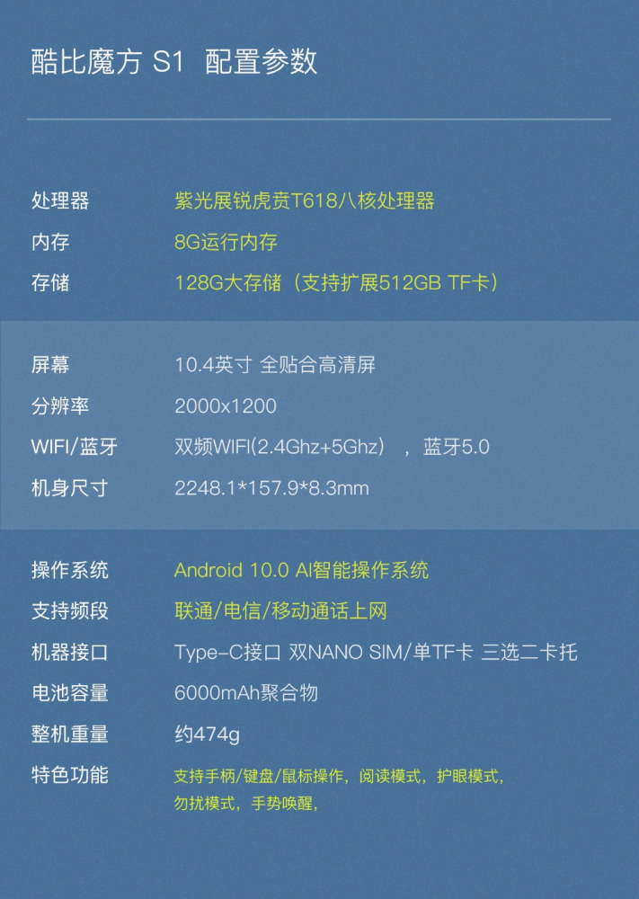 酷比魔方S1教育版采用紫光展锐虎贲T618强劲八核疾速处理芯片,搭配12nm制程工艺,性能强悍,运行顺畅快速,支持AI神经网络智能加速,算力强劲,BOX音腔体四扬声器,声音清晰响亮,上课无障碍。支持2.4G+5G双频段WiFi,不管在哪里学习,都能够提供稳定的网络。