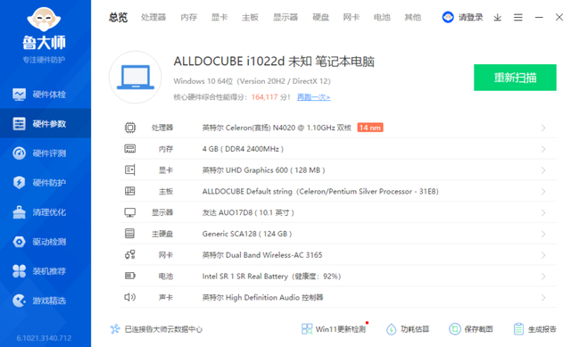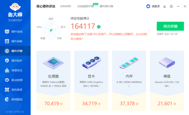 综合性能得分为:164117分,将近17万分,击败了全国6%的用户。