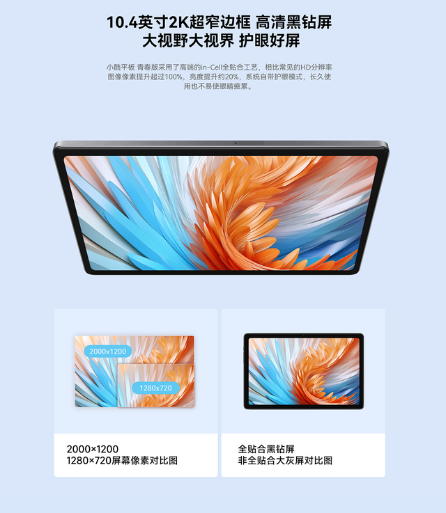 首先要说的是,酷比魔方小酷平板青春版采用了in-Cell全贴合工艺的2K高清护眼黑钻屏,带来了超过常见HD分辨率100%的图像像素提升以及约20%的亮度提升。这意味着视觉享受将更加清晰、细腻,为你带来更震撼的视觉体验。此外,它还配备了自带的护眼模式,长时间使用也不会导致眼睛疲劳,为你的眼睛健康保驾护航。