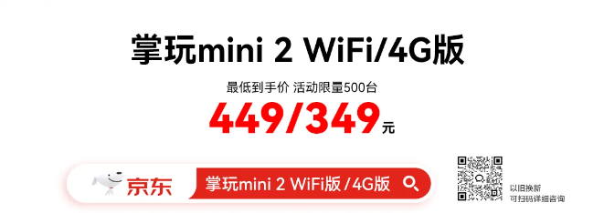 掌玩mini 2系列京东百亿补贴活动,享受立减100元的优惠,同时旧机换新最高可抵扣550元,最低价格仅需349元。现在就填写表格参与活动,还有机会赢取神秘彩蛋奖励,机会难得,不容错过!