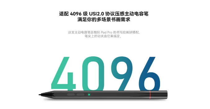 目前酷玩Pad Pro海外版已全面适配4096压感主动电容笔,国内版待下周升级固件后,同样全面支待4096压感主动电容笔。