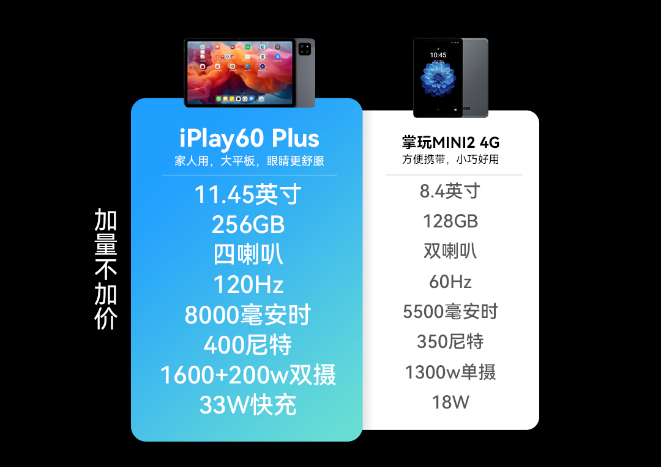 iPlay60 Plus采用11.45英寸大屏设计,相比掌玩mini2 4G版的8.4英寸,屏幕更大,视觉体验更佳。对于长辈来说,大屏显示让字体更加清晰,有效保护视力。而对于孩子们,超大屏幕能够提供更为沉浸的学习和娱乐体验。