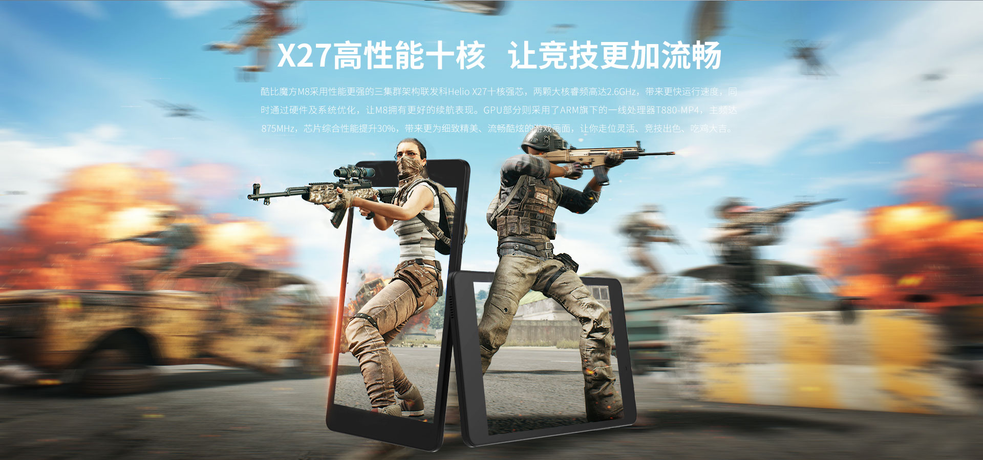 酷比魔方M8采用性能更强的三集群架构联发科Helio X27十核强芯,两颗大核睿频高达2.6GHz,带来更快运行速度,同时通过硬件及系统优化,让M8拥有更好的续航表现。GPU部分则采用了ARM旗下的一线处理器T880-MP4,主频达875MHz,芯片综合性能提升30%,带来更为细致精美、流畅酷炫的游戏画面,让你走位灵活、竞技出色、吃鸡大吉。