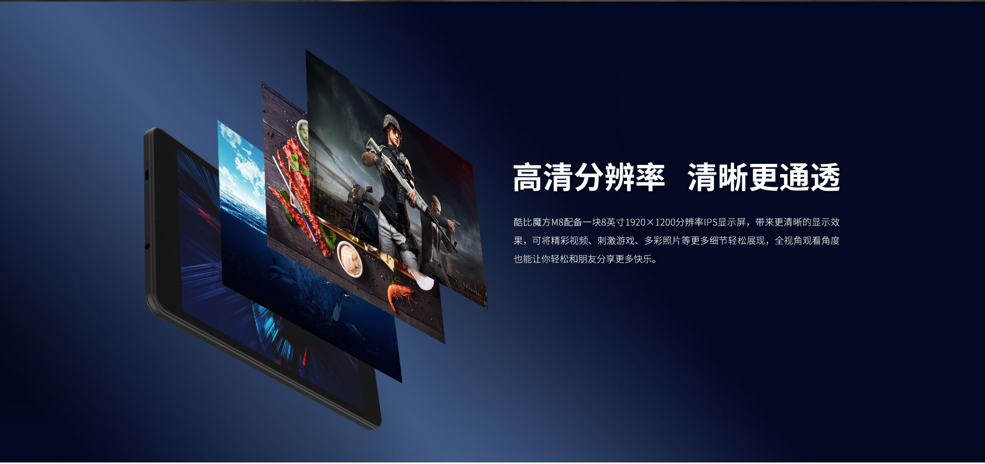 酷比魔方M8配备一块8英寸1920×1200分辨率IPS显示屏,带来更清晰的显示效果,可将精彩视频、刺激游戏、多彩照片等更多细节轻松展现,全视角观看角度也能让你轻松和朋友分享更多快乐。