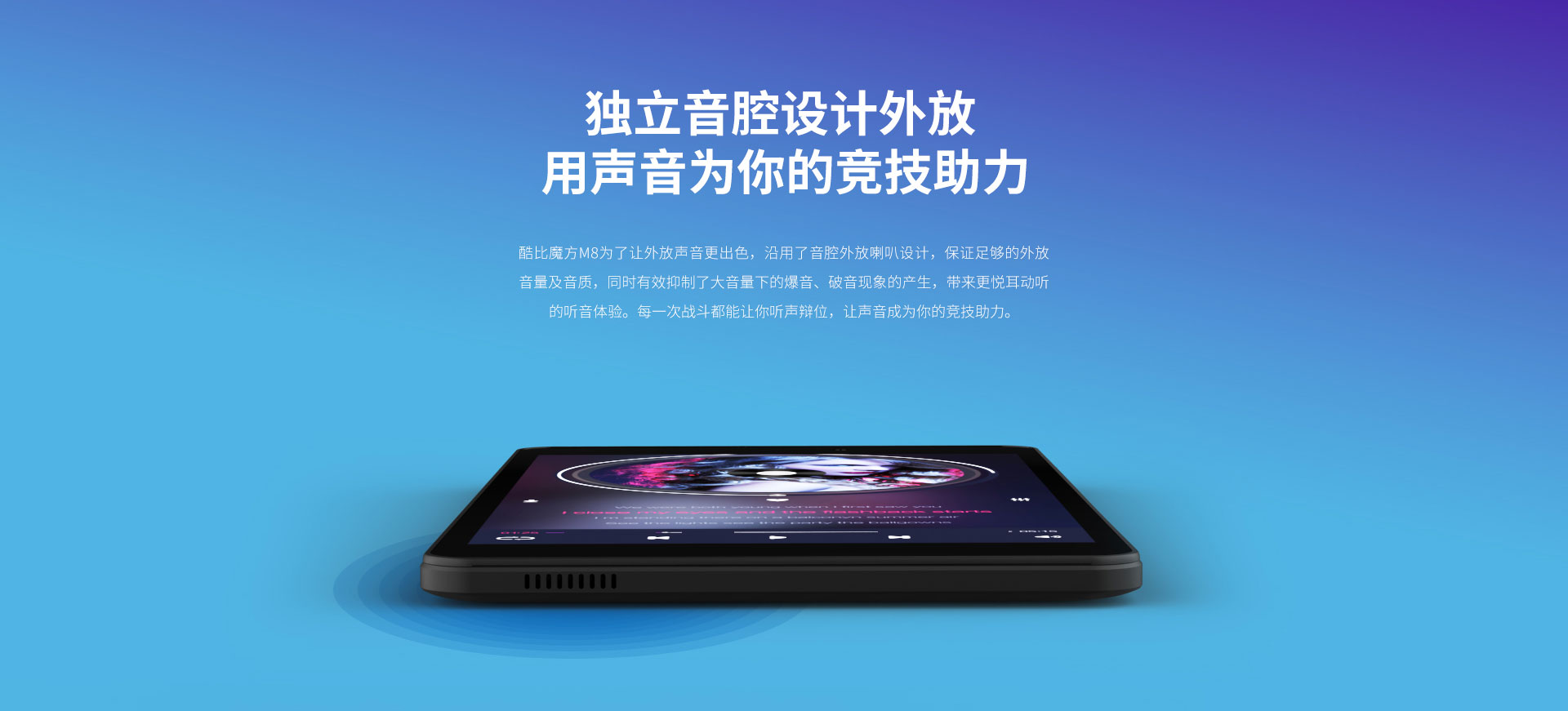酷比魔方M8为了让外放声音更出色,沿用了音腔外放喇叭设计,保证足够的外放音量及音质,同时有效抑制了大音量下的爆音、破音现象的产生,带来更悦耳动听的听音体验。每一次战斗都能让你听声辩位,让声音成为你的竞技助力。