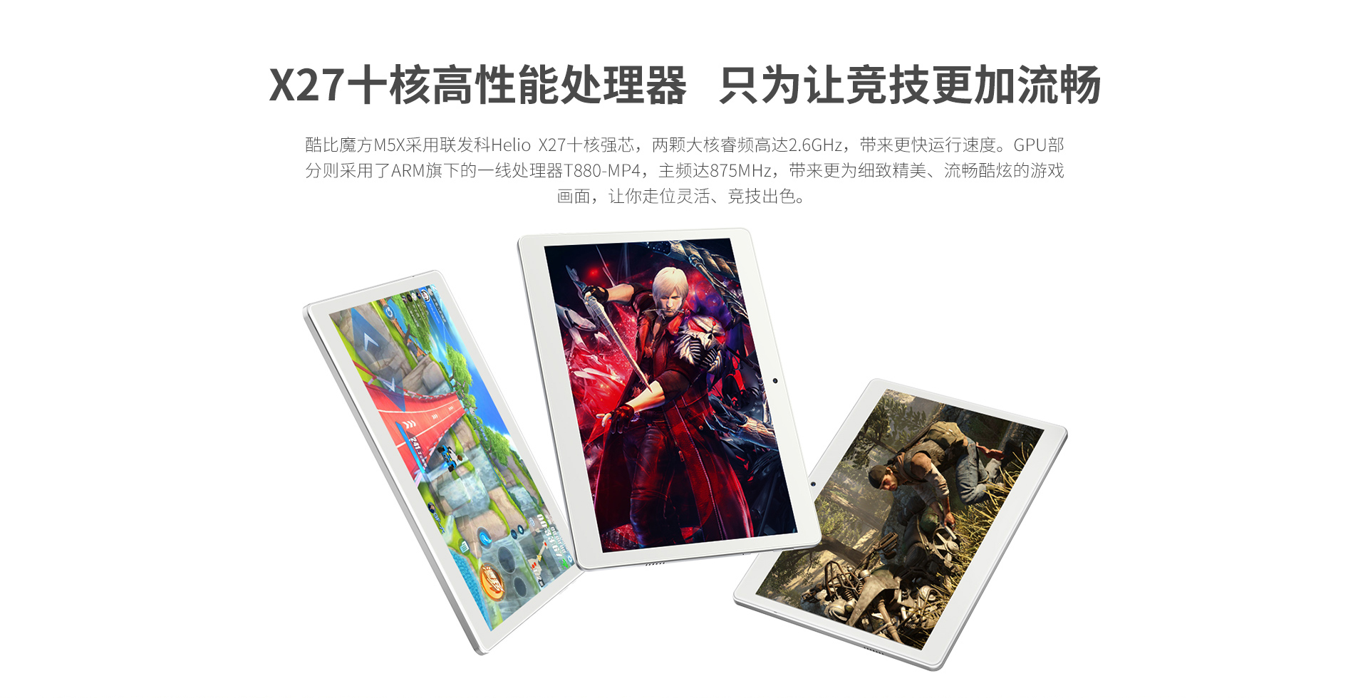 酷比魔方M5X采用联发科Helio X27十核强芯,两颗大核睿频高达2.6GHz,带来更快运行速度。GPU部分则采用了ARM旗下的一线处理器T880-MP4,主频达875MHz,带来更为细致精美、流畅酷炫的游戏画面,让你走位灵活、竞技出色。