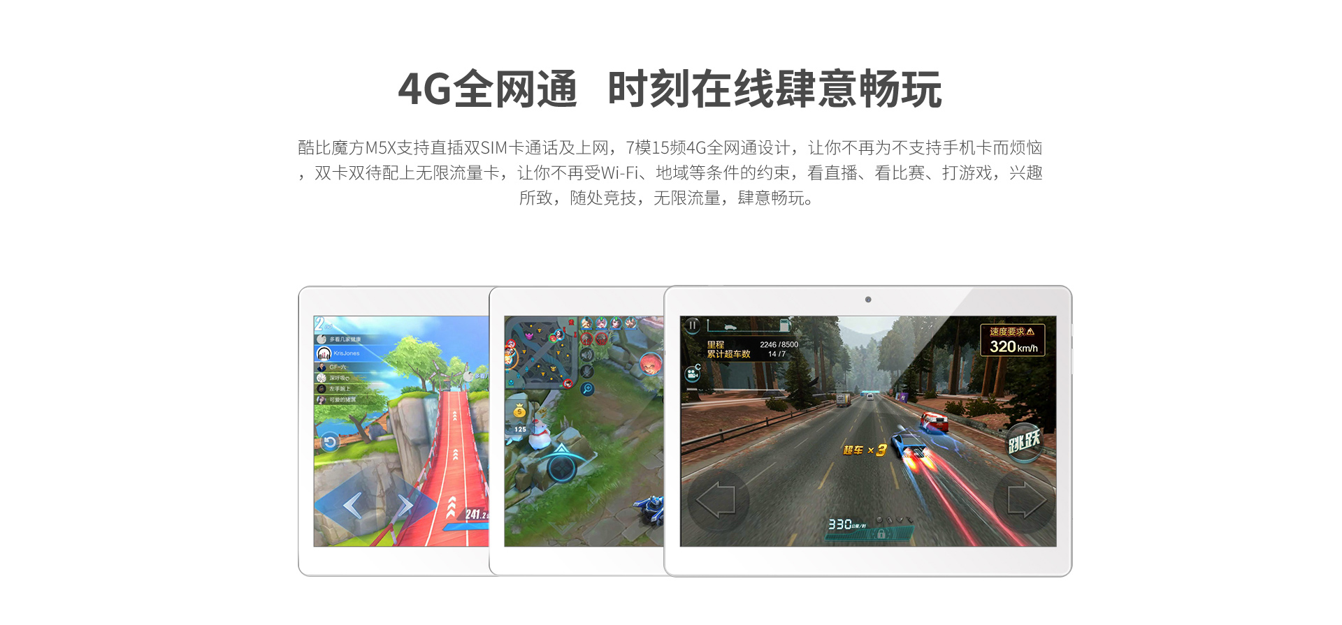 酷比魔方M5X支持直插双SIM卡通话及上网,7模15频4G全网通设计,让你不再为不支持手机卡而烦恼,双卡双待配上无限流量卡,让你不再受Wi-Fi、地域等条件的约束,看直播、看比赛、打游戏,兴趣所致,随处竞技,无限流量,肆意畅玩。