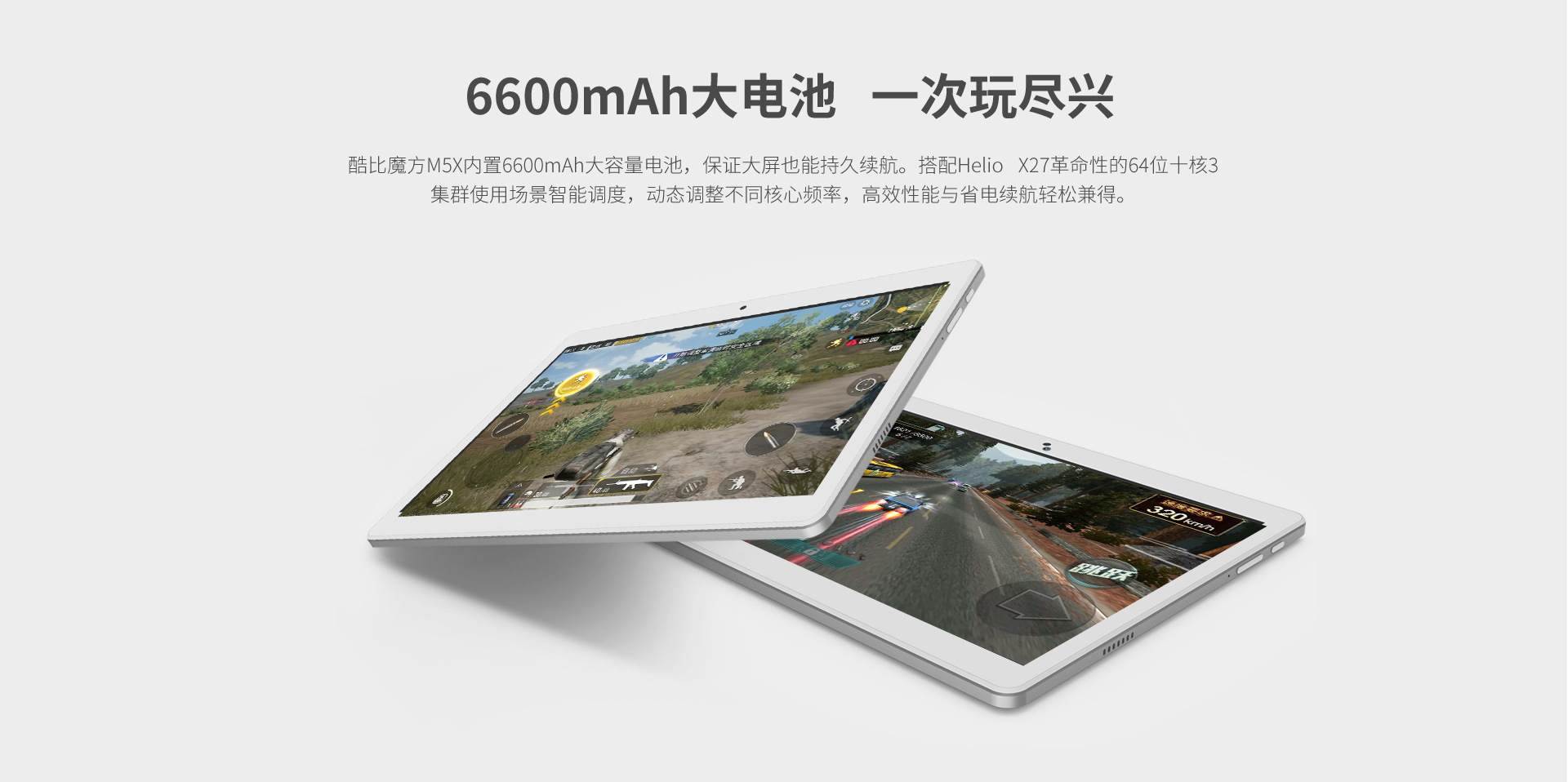酷比魔方M5X内置6600mAh大容量电池,保证大屏也能持久续航。搭配Helio X27革命性的64位十核3集群使用场景智能调度,动态调整不同核心频率,高效性能与省电续航轻松兼得。