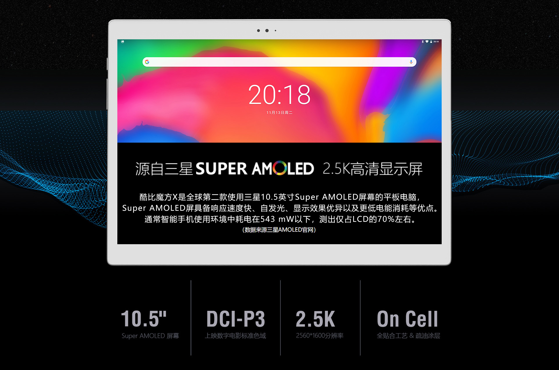 酷比魔方X采用的这块三星10.5英寸Super AMOLED屏幕拥有2560×1600超高清分辨率,让画面细致生动,纤毫毕现,每行文字都超乎寻常的明锐清晰。NTSC色域高达105%,DCI-P3是上映数字电影的电影院需要配备的标准色域,有了AMOLED屏幕,影院级画质尽在掌中。