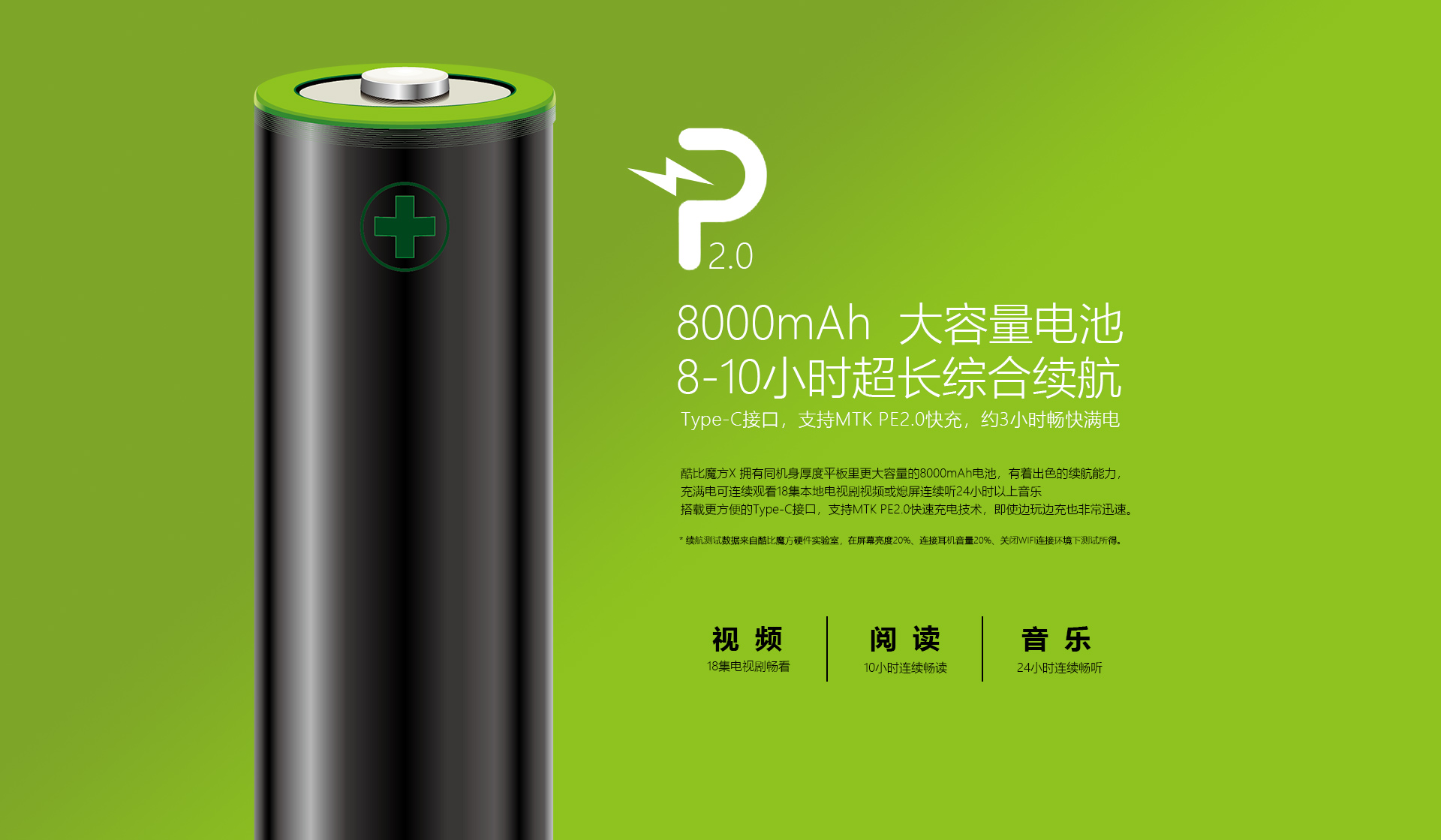 充满电后,酷比魔方X支持18集电视剧畅看或10小时电子书连续畅读或24小时HiFi音乐连续畅听。(* 续航测试数据来自酷比魔方硬件实验室,在屏幕亮度20%、连接耳机音量20%、关闭WiFi连接环境下测试所得。)