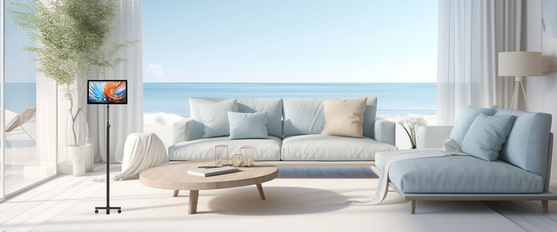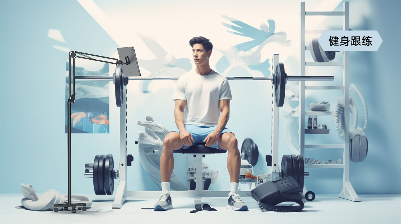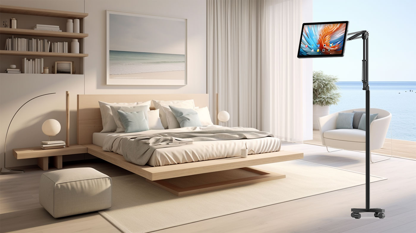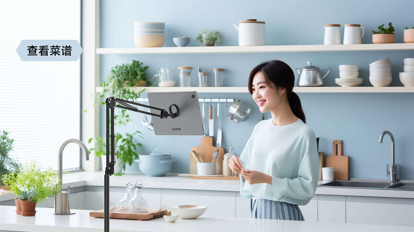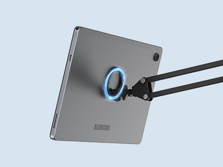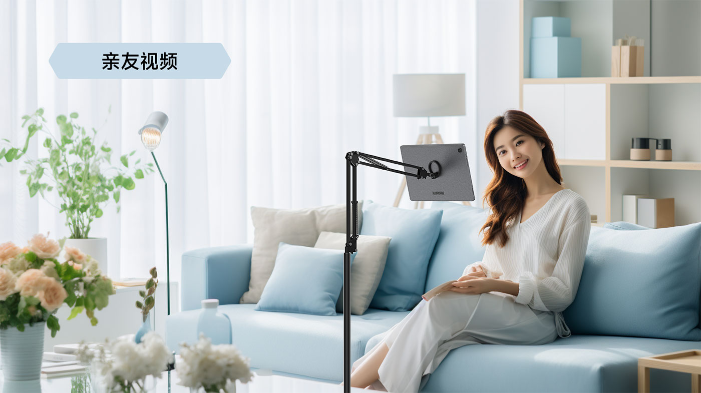 配搭万向轮折叠落地支架+智能磁吸环,可全屋随意行走,可多角度调节,横看,竖看,百变姿态,走到哪用到哪。