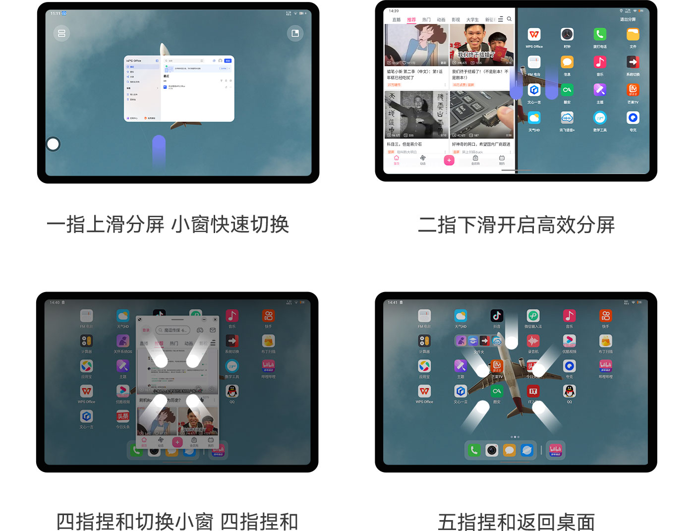 自由分屏能大大提升平板的使用效率,一屏多用,与小窗同时开启可最多开启4个窗口,边学习边记录,多任务更高效。一拖分屏,2指下滑即可快速开启分屏模式还有多种快捷手势快速打开分屏模式。