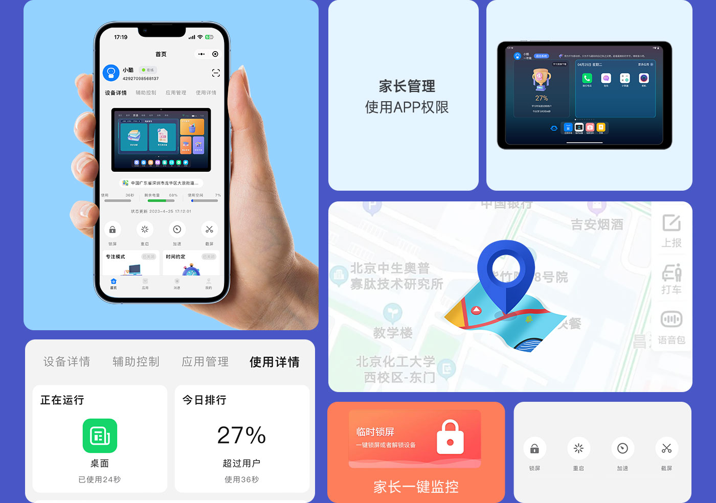 家长可通过小程序,控制平板的使用时间、使用APP权限、定位、页面截图等功能实现平板管控