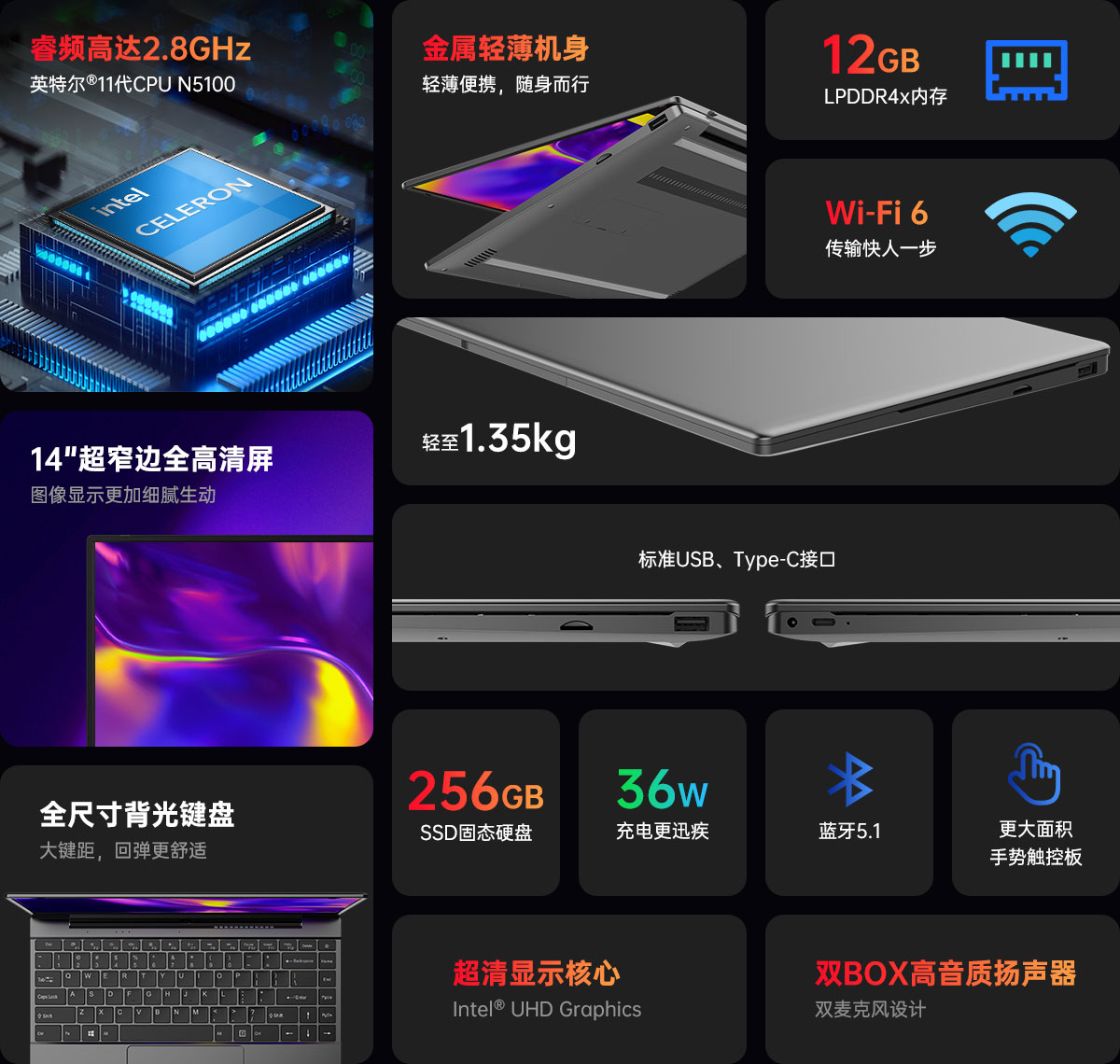酷比魔方将14英寸笔记本的性能和体验提升到一个全新的高度GT Book搭载睿频高达2.8GHz的英特尔® 11代超节能CPU N5100、 Intel® UHD Graphics超清显示核心以及12GB LPDDR4x高速内存和256GB固态硬盘存储薄处约6mm的金属机身仅有1.35kg,轻薄便携,性能出众还有新版Wi-Fi、蓝牙5.1、快充、大功率双BOX音腔扬声器等