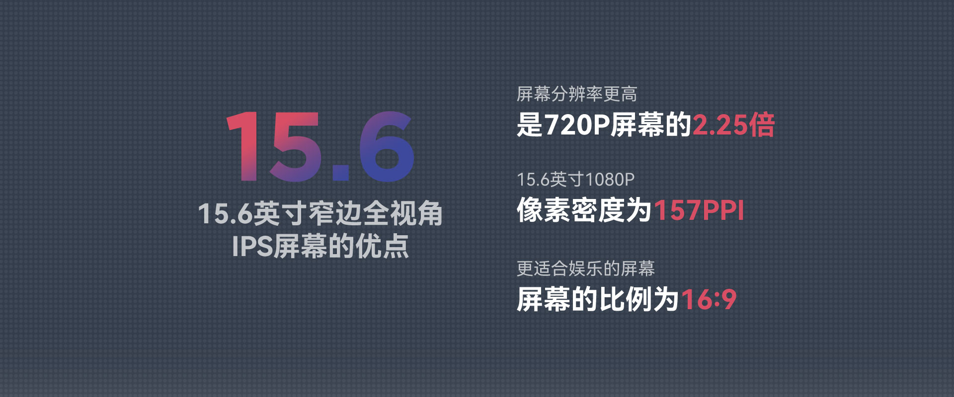 1920×1080分辨率,IPS全视角显示屏,约2.5倍于720P显示屏的沉浸式体验,让绚丽的色彩与逼真的影像细节完美结合,多样精彩,都在这块15.6"的高清显示屏上生动呈现。