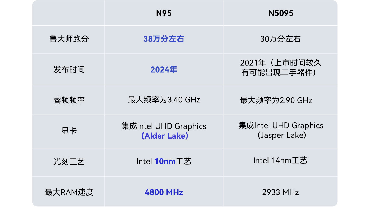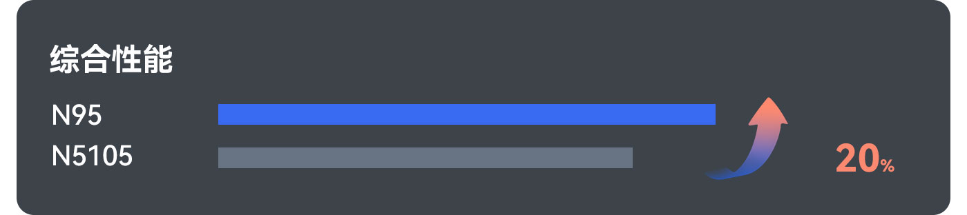 据Benchmark评测,N95比N5105综合性能提高了20%,充分满足Office办公、设计、娱乐等需求,即便需要精密复杂计算的软件,也能轻松应对。