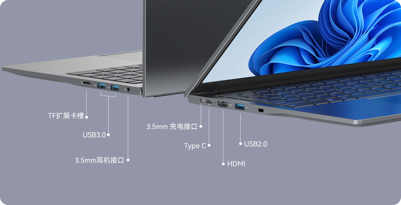 酷比魔方GTBook 15 Gen2配备Type-C接口,支持数据传输等功能;通过GTBook 15 Gen2上标准的USB3.0接口,让你外接键盘鼠标及U盘、移动硬盘、有线网络转接器等设备时更便捷;此外,GTBook 15 Gen2还拥有一个HDMI视频输出接口。