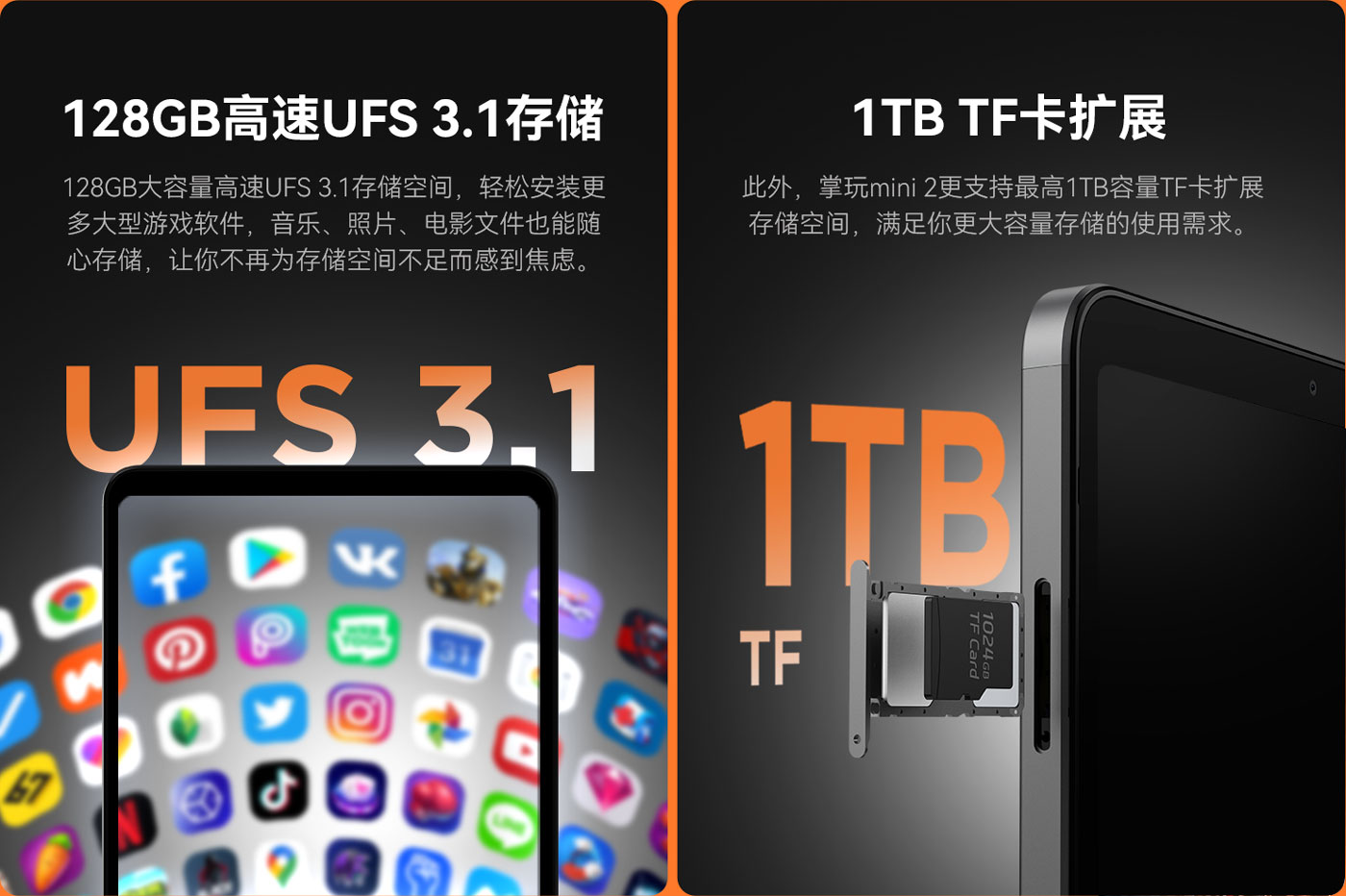 掌玩mini 2为你配备了8GB LPDDR5高速运行内存,至高可扩展8GB虚拟内存,总计16GB的融合大内存带来更好使用体验,在更多App间顺畅切换,告别卡顿,享受疾速流畅。